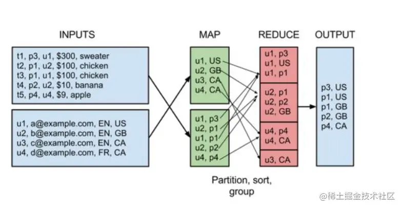 比如说,用MapReduce实现两个表的Join都是一个很有技巧性的过程,如下图所示: