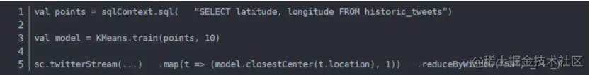 这段程序的第一行是用Spark SQL 查寻出了一些点,第二行是用MLlib中的K-means算法使用这些点训练了一个模型,第三行是用Spark Streaming处理流中的消息,使用了训练好的模型。