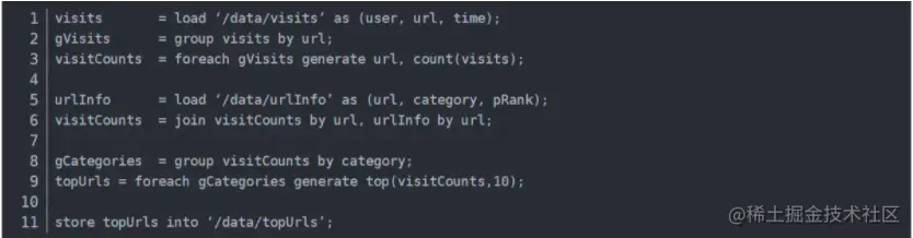 Apache Pig也是Hadoop框架中的一部分,Pig提供类SQL语言(Pig Latin)通过MapReduce来处理大规模半结构化数据。而Pig Latin是更高级的过程语言,通过将MapReduce中的设计模式抽象为操作,如Filter,GroupBy,Join,OrderBy,由这些操作组成有向无环图(DAG)。例如如下程序: