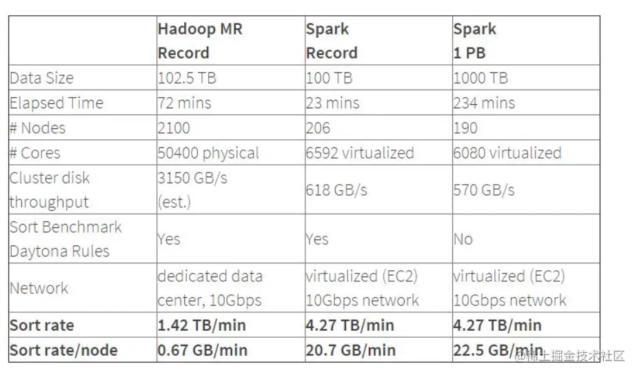 Spark的性能相比Hadoop有很大提升,2014年10月,Spark完成了一个Daytona Gray类别的Sort Benchmark测试,排序完全是在磁盘上进行的,与Hadoop之前的测试的对比结果如表格所示: