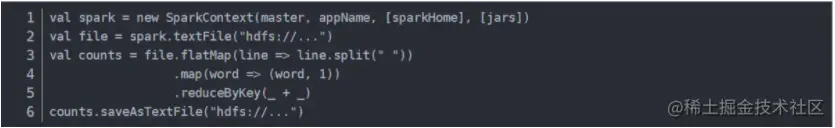 Spark的API非常简单易用,Spark的WordCount的示例如下所示: