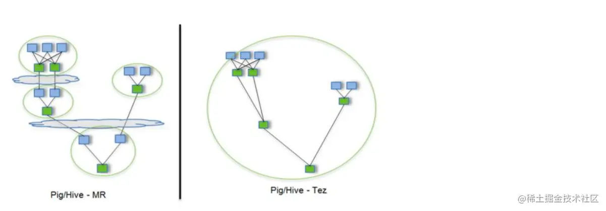 途中蓝色方块表示Map,绿色方块表示Reduce,云状表示写屏障(write barrier,一种内核机制,可以理解为持久的写),Tez的优化主要体现在:去除了连续两个作业之间的写屏障去除了每个工作流中多余的Map阶段(Stage)