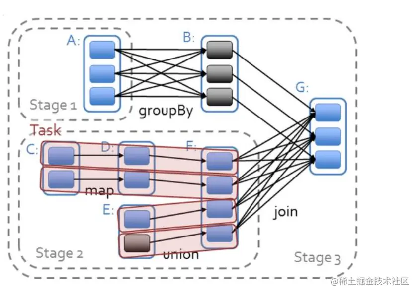=>一个Job可以包含RDD的多个转换操作,在调度时可以生成多个阶段(Stage),而且如果多个map操作的RDD的分区不变,是可以放在同一个Task中进行。