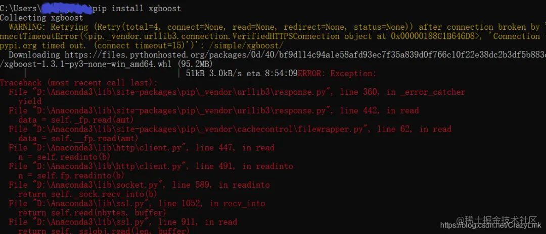 打开 cmd 命令模式,输入 pip install xgboost但网络需要架梯子(不知道是不是我的网不好),我不架梯子会因网络问题出现以下报错: