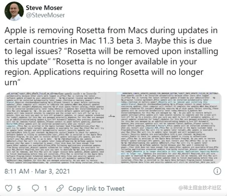 在今天向开发者发布的 macOS 11.3 的第三个测试版中,MacRumors 编辑 Steve Moser 在测试版的代码中发现了新的字符串,显示 “Rosetta 将在安装此更新后被移除”。另一个新字符串写道:“Rosetta 在该地区不再可用。需要 Rosetta 的应用程序将不再运行。”
