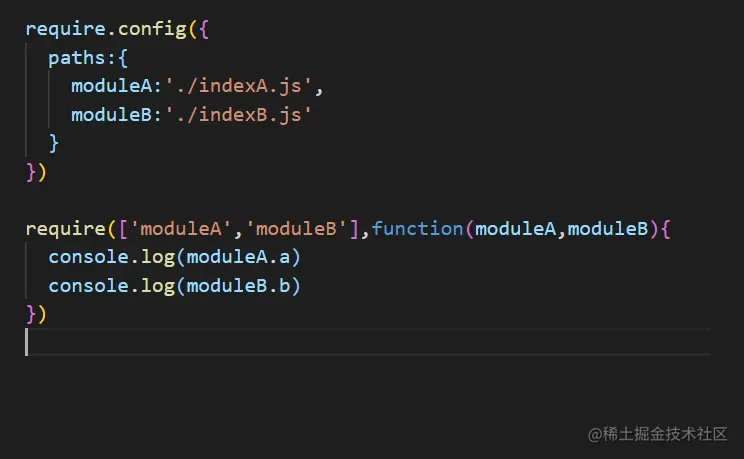 像上面打印a和b变量这个回调函数,它是依赖于前面的moduleA和moduleB模块的,被依赖的模块同时被加载,不考虑加载顺序问题,只有需要的模块文件加载完成才会去执行回调函数