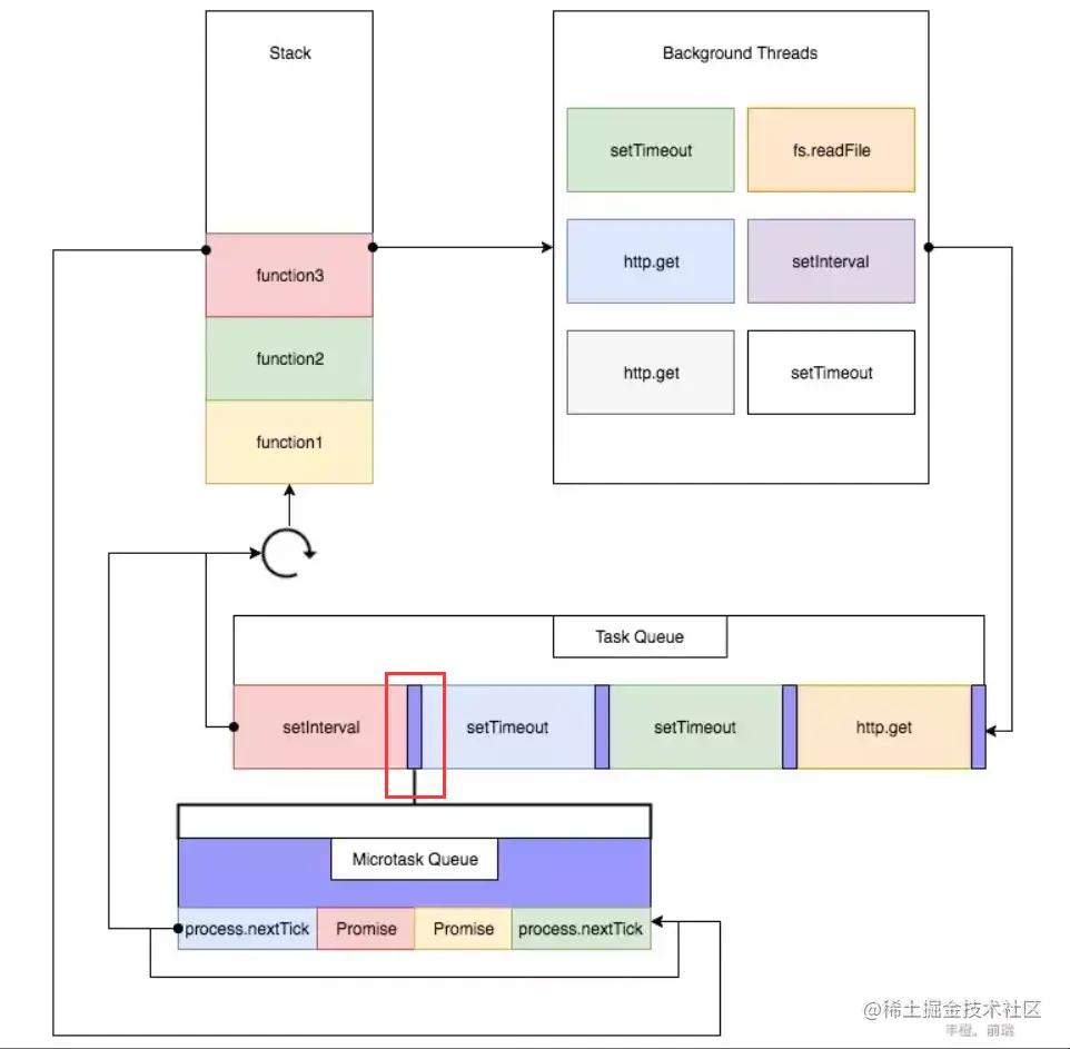 组成:一个函数执行栈stack、一个事件队列Task Queue(可看作宏任务队列)、一个微任务队列Microtask Queue。