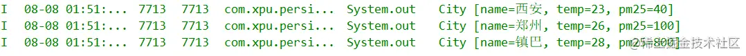 return "City [name=" + name + ", temp=" + temp + ", pm25=" + pm25 + "]";