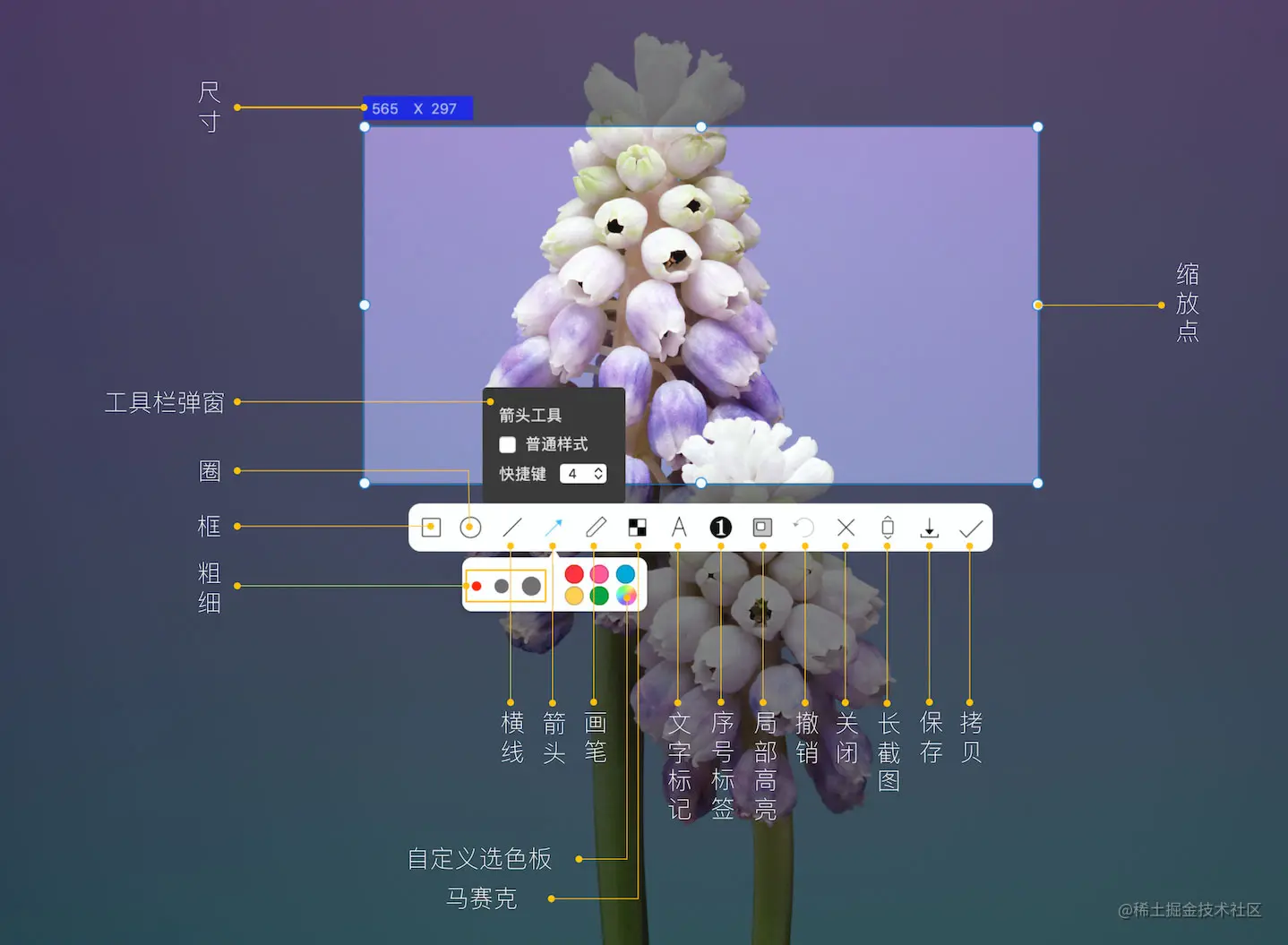 支持:区域截图、窗口截图、长截图、延时截图。小工具齐全,包括:横线工具、箭头工具、画笔工具、文字工具、马赛克、步骤标注工具、局部高亮工具、长截图工具、矩形工具、椭圆工具。基本每个工具都可以进行自定义。