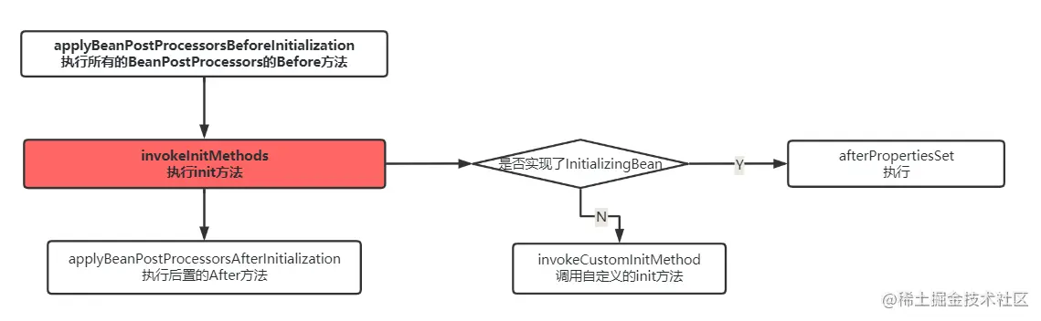 这个就是这个方法的执行流程图,相信到这个地方,大家应该对于为什么BeanPostProcessor的before方法会在init方法执行了解了。这个方法的作用仅仅是用来进行一个生命周期的打印,对象在之前已经创建了。