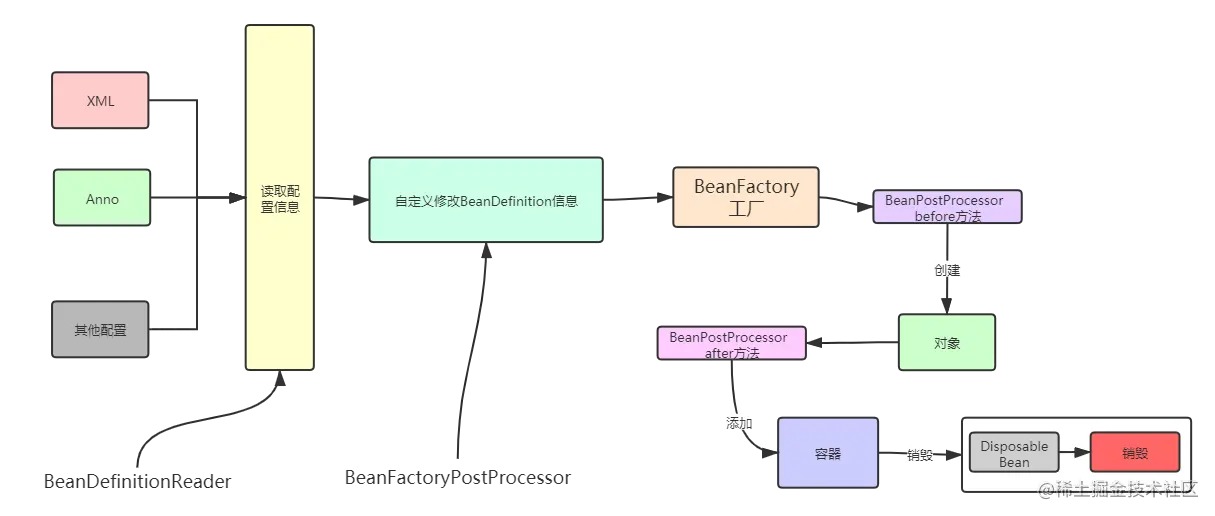 这个时候又有了一个问题,我们不想通过BeanFactory直接生产了,需要对这个工厂进行一些特定处理,于是出现了BeanFactoryPostProcessor,用来对工厂做一些特定的处理。我们自己可以通过实现这个接口,进行自定义BeanFactory。又有兄弟说了:我想单独创建一些我喜欢的对象,安排,FactoryBean诞生了,它可以帮助我们创建一个我们需要的对象(第四部分详细解释他们之间的区别)。
