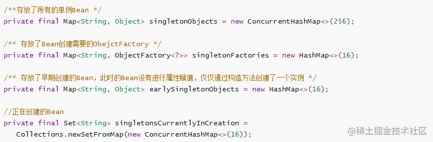 在发生循环引用的时候,它首先通过ObejctFactory工厂将Bean创建出来,**此时的对象并没有进行属性赋值,仅仅在堆中开辟了空间。**然后将此时的Bean添加到earlySingletonObjects容器里,**也就是说这个容器中保存的Bean都是半成品。**而在之后的属性赋值中,由于对象为单例的,所以其引用地址不会发生变化,即对象最终是完整的。