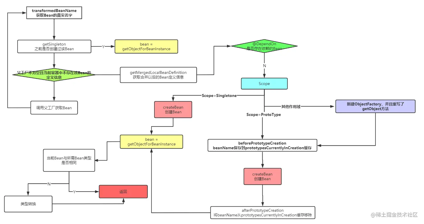 - 先拿到当前要实例化的Bean的真实名字,主要是为了处理FactoryBean,拿到以后,从当前容器中看是否已经创建过该Bean,如果存在直接返回。
