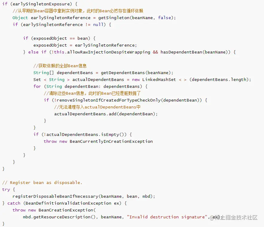 查看早期容器缓存中(缓存中的二级缓存中是否有该Bean)。如果有,则说明存在循环依赖,则进行处理