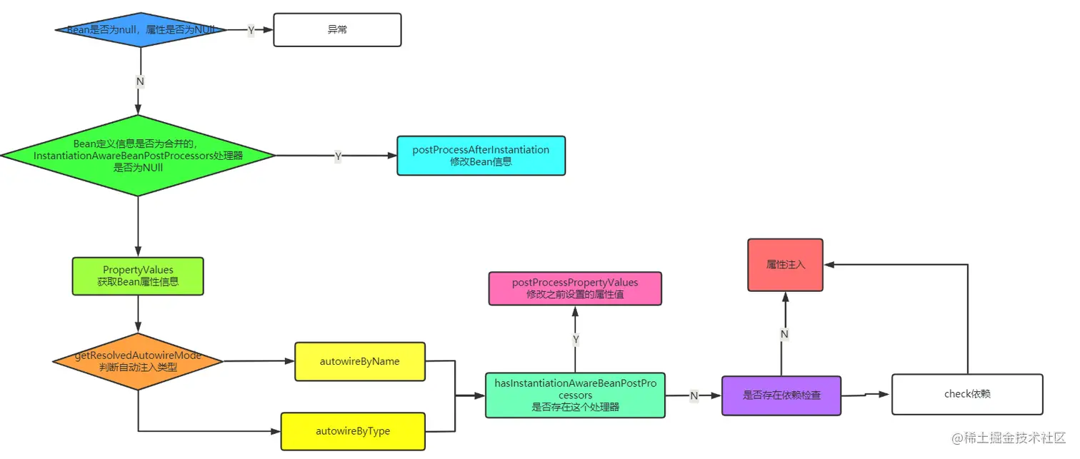- 首先判断传入的Bean是否为null,如果为null则判断Bean定义信息中是否存在属性值,如果存在,异常;如果不存在跳过