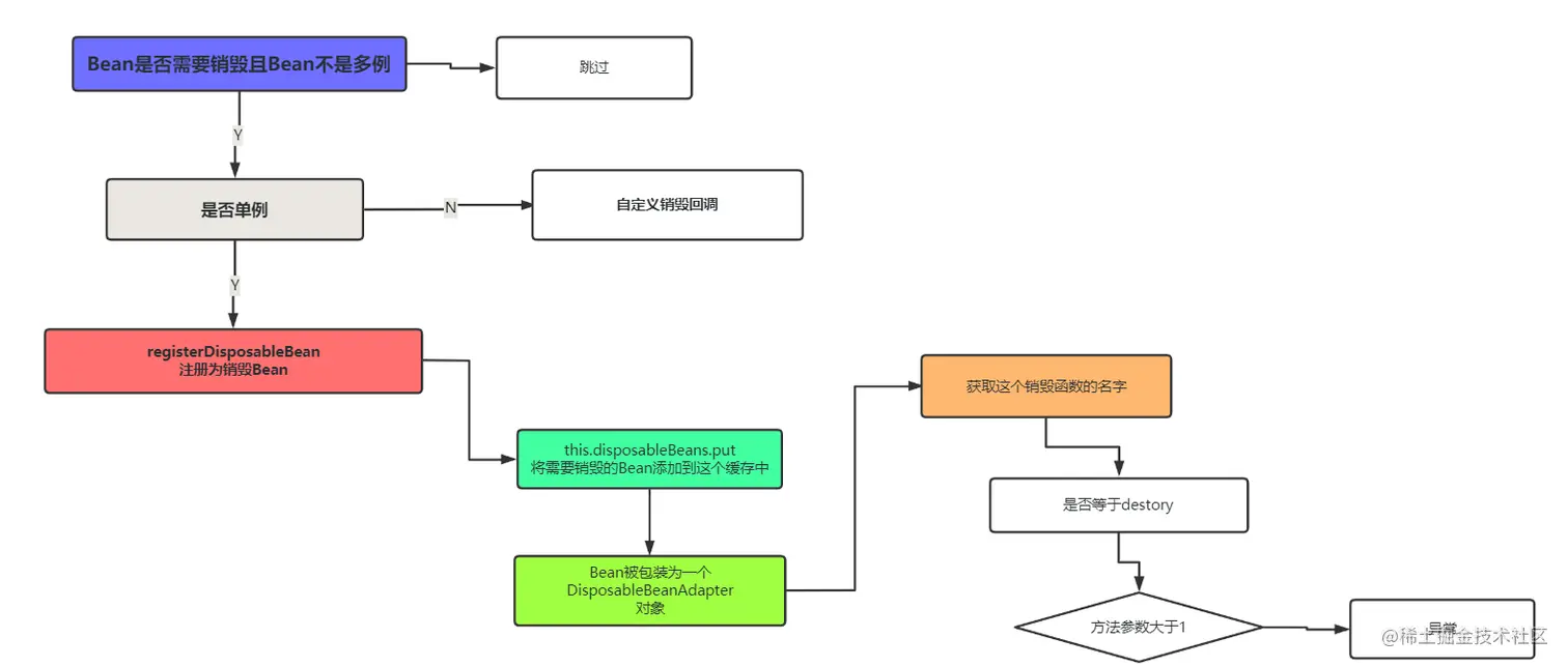 在封装为DisposableBeanAdapter的过程中,会首先判断该Bean中是否存在destroy方法,然后给赋值给destroyMethodName变量。再次判断这个方法的参数,如果参数的个数大于1,则抛出异常