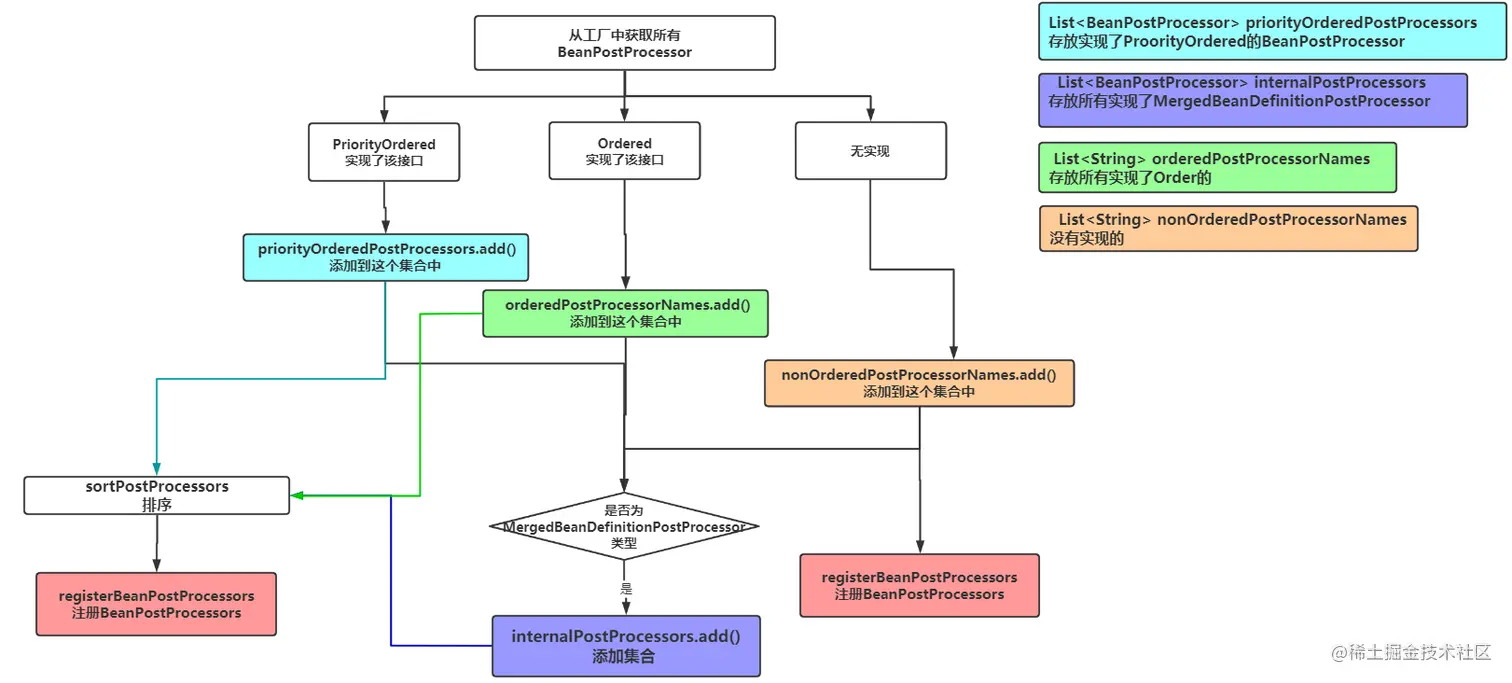 首先拿到工厂中所有的BeanPostProcessor类型的Bean,然后分类处理,排序注册。