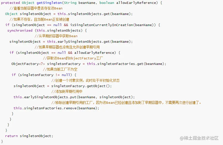 再来看一个点,这个就是从容器中获取Bean的主要方法,也是解决循环依赖的逻辑