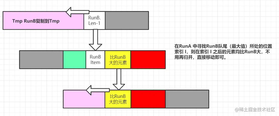 // 简化操作,如果Run2要合并的元素只有一个,这个元素不比Run1的最大值大,也不比当前Run1索引的最小值大(base1的位置是大于Run2队首元素的位置),故Run2这个元素应该放置到Run1第一个