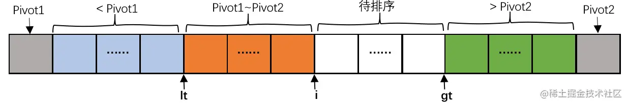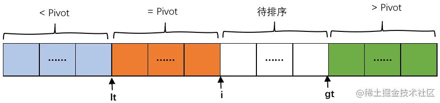 单轴三取样切分快速排序 作为单轴快速排序的优化版本,其主要优化相同元素过多情况下的快排效率,同样选取一个基准值,但将待排序数组划分三部分: 大于pivot、等于pivot、大于pivot。