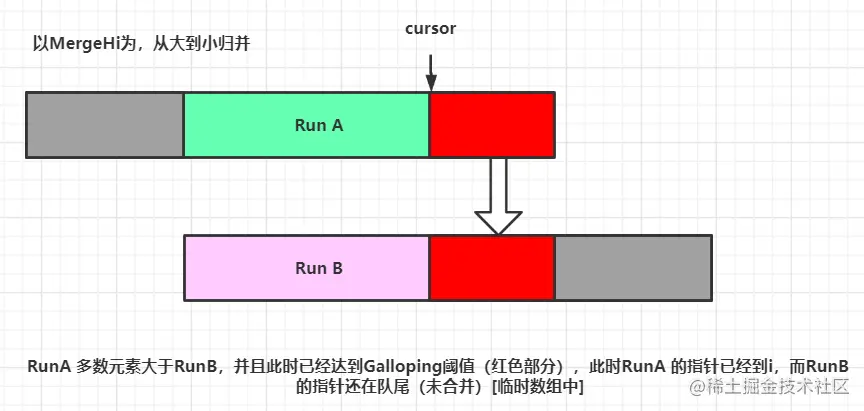 * 一方已经连续合并超过minGallop次,则进入GallopingMode