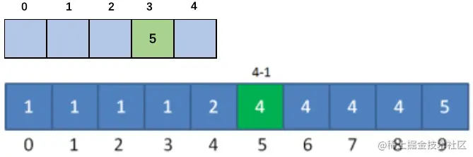 第二步:我们从后向前遍历原序列,此时为5,则在最终排序序列的位置为4(索引为3)的地方放置5,并将Count序列的5索引处的值-1。