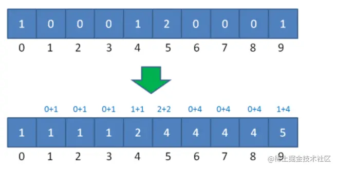 例子:输入数组 [ 0,9,5,4,5 ],范围0 ~ 9