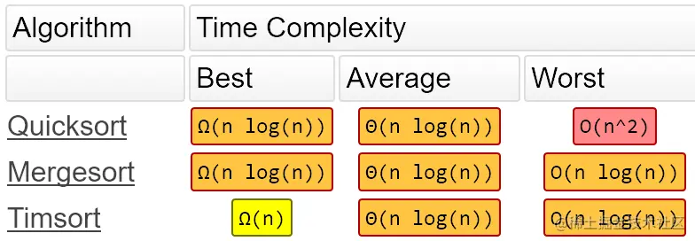 Timsort是工业级算法,其混用插入排序与归并排序,二分搜索等算法,亮点是充分利用待排序数据可能部分有序的事实,并且依据待排序数据内容动态改变排序策略——选择性进行归并以及galloping。另外TimSort是一个稳定的算法,其最好的执行情况要优于普通归并排序,最坏情况与归并排序相仿: