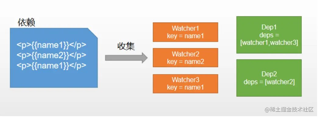 视图中出现每个key都需要一个Watcher来维护,一个key可能在出现多次,每个key创建一个dep,