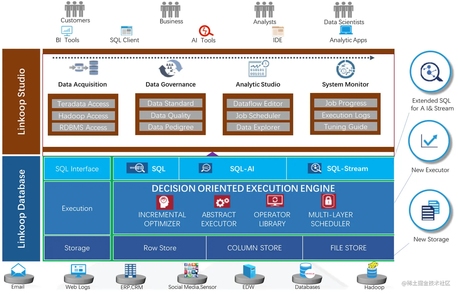 Linkoop DB 是聚云自研的纯国产分布式数据库,率先实现了 PB 级数据高性能分析、实时数据快速判断决策、预置机器学习引擎算法、基于通用设备按需扩展、多元异构数据融合分析等行业领先的功能。拥有内核专利的纯国产自研企业级人工智能数据库,吸收了MPP库和Hadoop两种技术路线的特长,以企业级分析型数据库能力为基础核心,增强了流式计算和人工智能计算能力,并且可以统一使用SQL驱动。