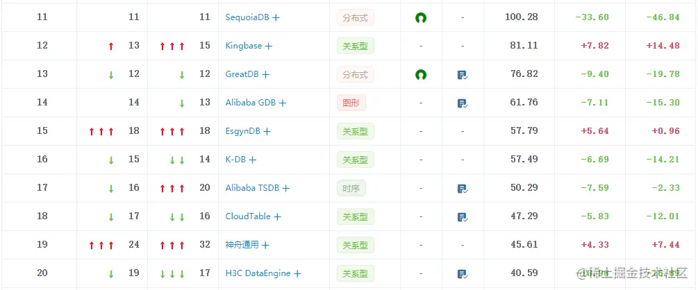 在11至20的榜单中有3款数据库产品排名上升,分别是Kingbase、EsgynDB、神舟通用,其中4款产品积分连续两月下滑。