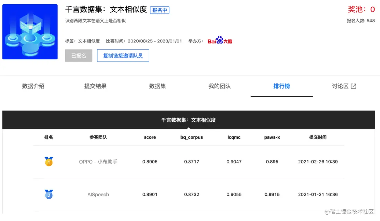 千言(luge.ai)是全面的面向自然语言理解和生成任务的中文开源数据集合,吸引了众多知名企业的算法工程师同台竞技。其中的文本相似度赛道尤为火爆,参赛队伍多达300余支,更是不乏OPPO、思必驰等AI领域的知名企业。其中,OPPO小布助手在千言文本相似度比赛中,也获得了第一名的好成绩。