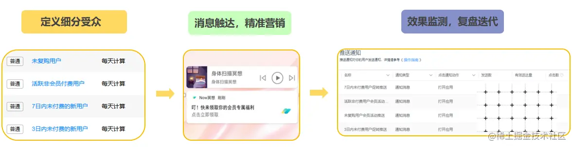 Now 冥想的运营人员通过华为分析服务的受众分群功能,将用户分为四类:3日内未付费的新用户、7日未付费的新用户、活跃非会员用户和未复购用户,结合华为推送、应用内消息等服务,针对不同受众推送不同的营销活动,并保持周期性的效果监测,通过查看消息的点击及用户购买转化率,不断调整运营策略,持续复盘、迭代文案和素材。经过多轮精准触达,新用户付费转化率环比增长35%,老用户续费转化率环比增长23%。