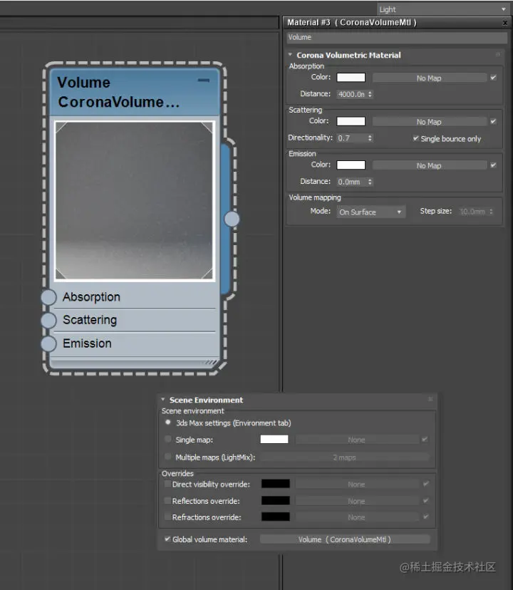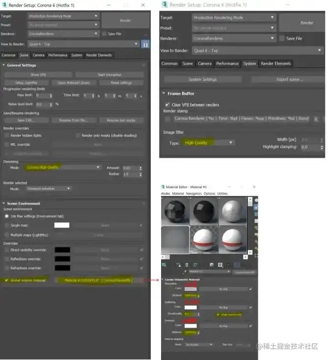 因为Corona渲染设置并不是那么技术化,所以除了在“Global Volume material”选项卡中添加“volumetric material”外,其他我都保持了默认值。