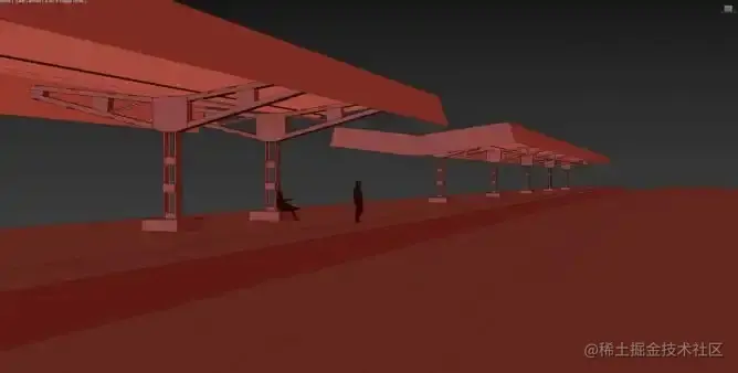 我从平台和屋顶的基本建模开始着手,只是使用了简单的“平面”(plane)。为了保证比例我在画面中放了两个人。其他的都是通过添加材质来实现的。