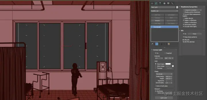 我使用的是Corona Sky(完全去饱和),没有日光。我还在窗户上放了一个面光来照亮室内。另外,我还用了Volumetrics。