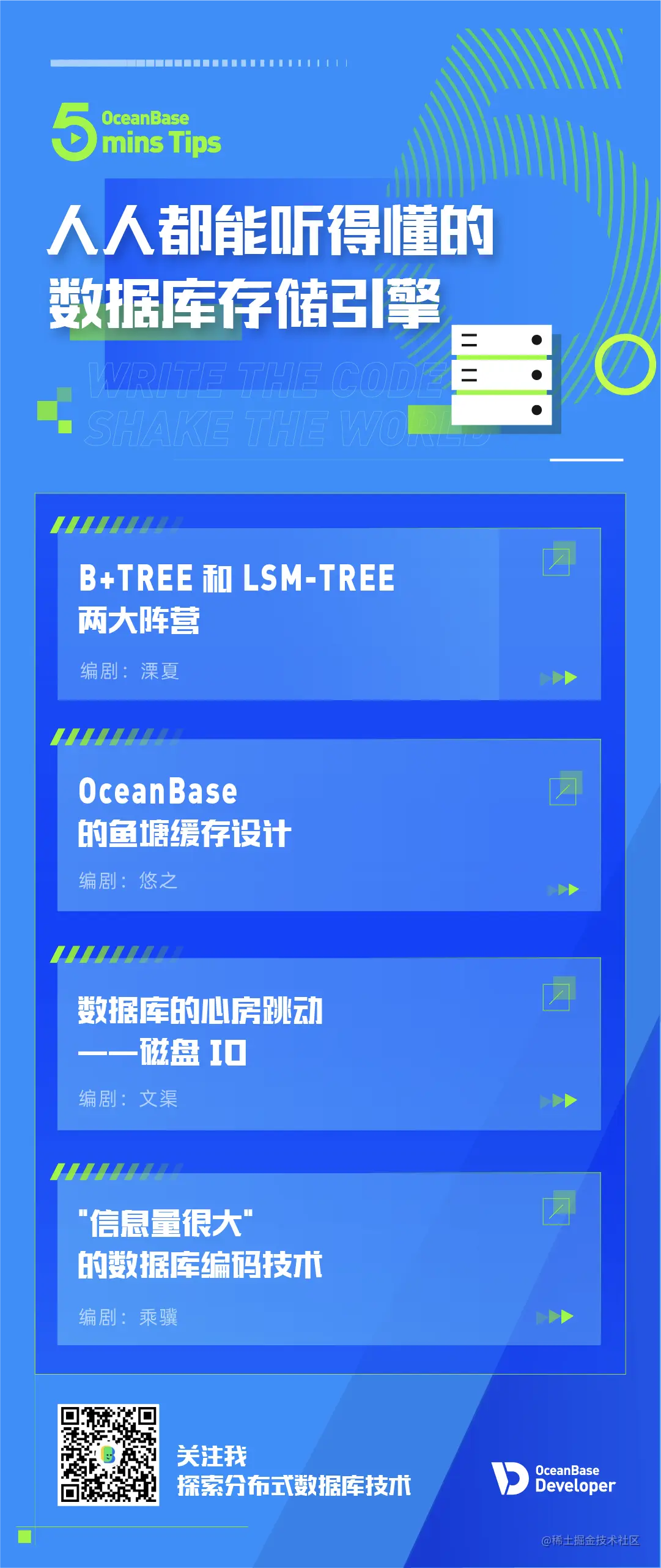 OceanBase 5mins Tips 是 OceanBaseDev 社群推出的系列技术短视频,五分钟讲解一个技术点,并于每周五准时与大家分享,已经有越来越多“追剧”的开发者们了,如果你还没有关注,欢迎在文末关注我们的视频号(ID:OB小话唠)或者访问 OceanBase 官网“开发者”版块。