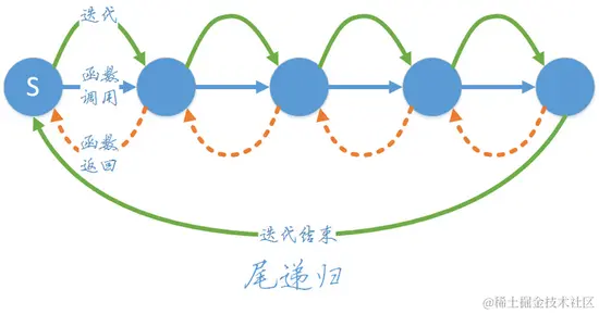 尾递归函数递归调用返回时正好是函数的结尾,因此递归调用时就不需要保留当前栈帧,可以直接将当前栈帧覆盖掉。