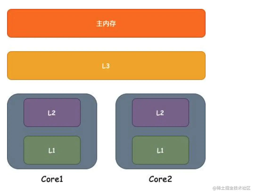 CPU和内存之间还有个CPU缓存的概念,CPU缓存又分为L1、L2和L3三级;级别数字越小容量也越小,同时离CPU也越近访问速度会越快;L1和L2集成在CPU上,L3集成在主板上,盗个图展示如下: