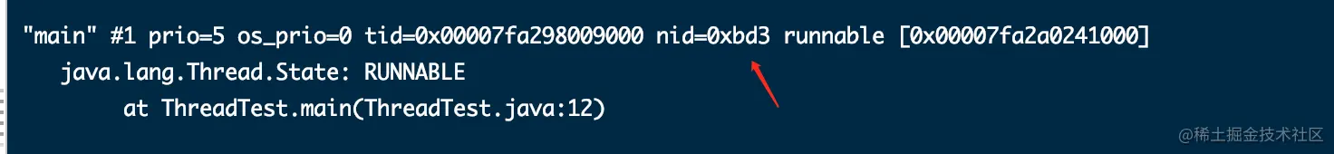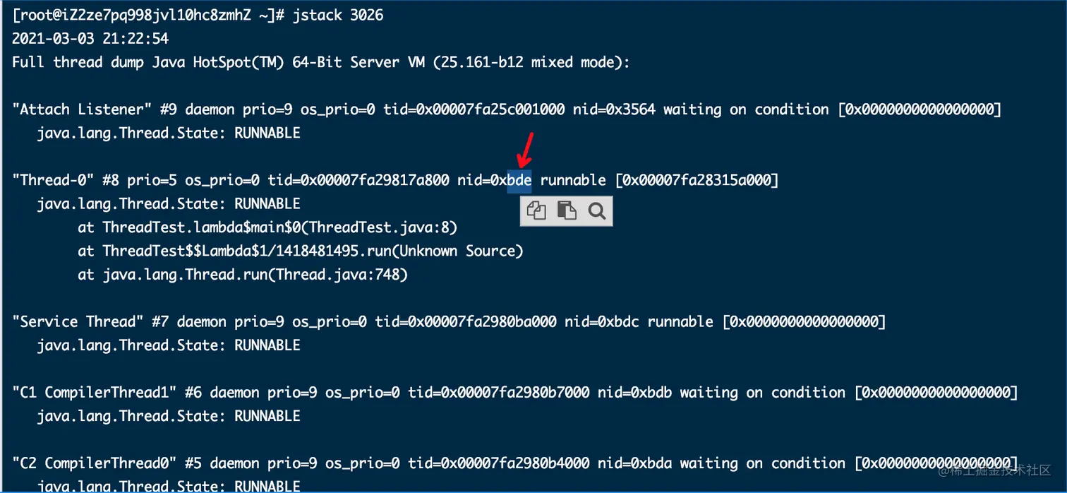 这时候我们再运行一下jstack 3026查看一下jvm进程中正在运行的线程,可以看到有一个线程的nid是0xbde,这是一个16进制的数字,我们转移一下变成了3038,这和我们上面看到的占用CPU最多的进程idPID是一样的,