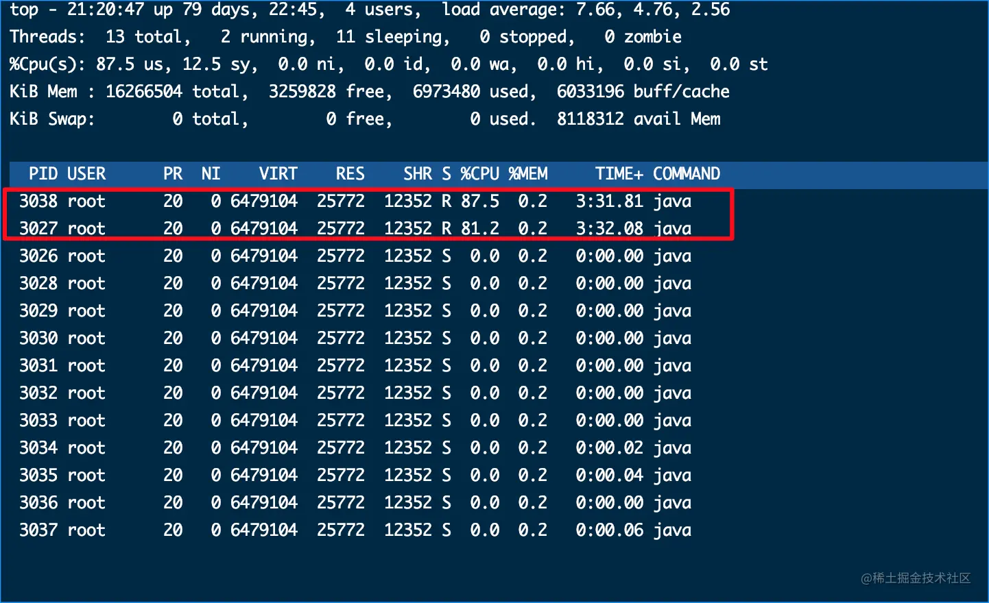 我们再运行top -n 1 -H -p 3026看一下进程中的每个线程占了多少CPU,可以看到下图中,有两个线程吃CPU吃的非常多,因为它是我们刚刚写的两个死循环的线程,