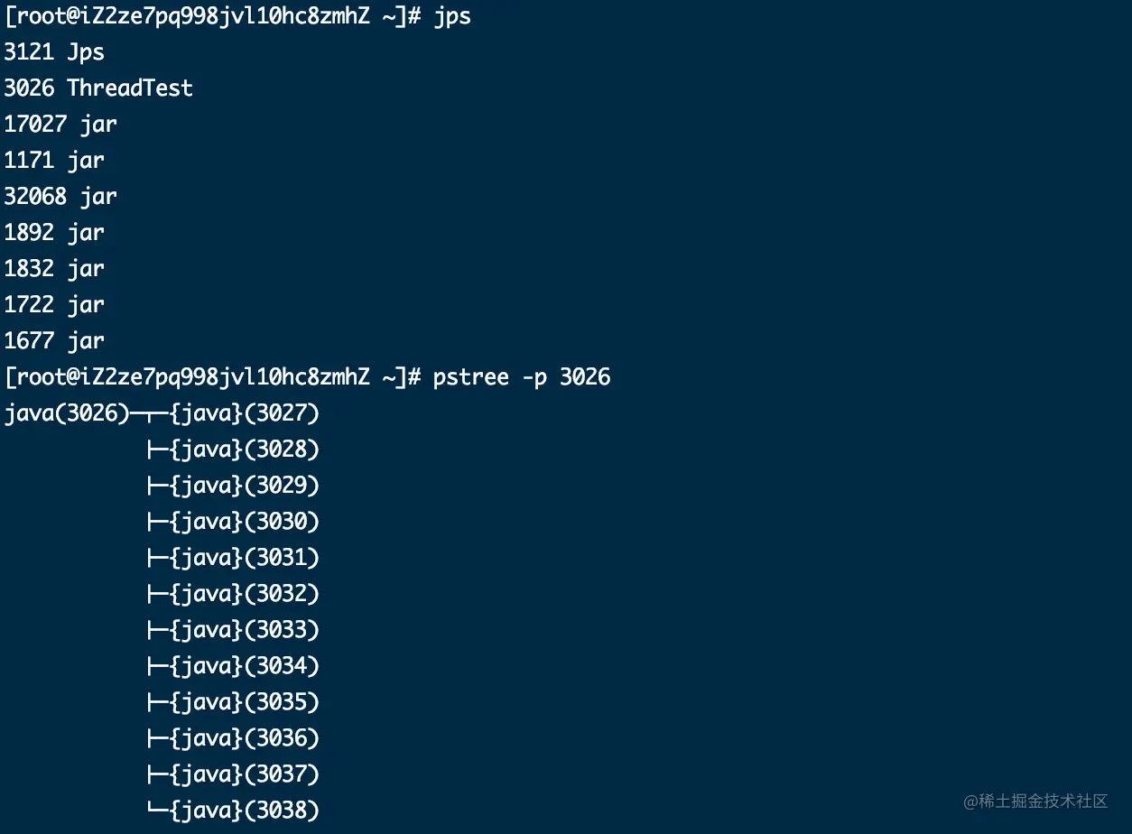 使用 javac ThreadTest.java && java ThreadTest 运行代码,使用jps找到我们刚刚运行的ThreadTest进程id,