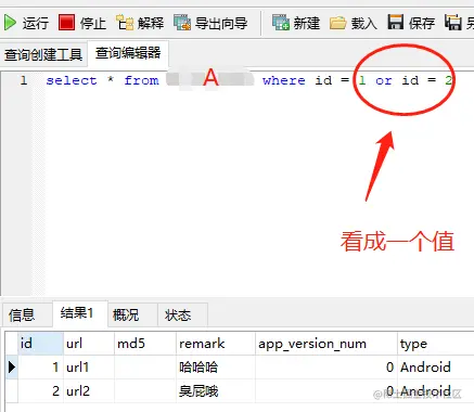 直接查到的就是两条数据,虽然数据是我模拟的,我自然知道id=1,id=2,这些都不是问题,只要记住一个问题就是我输入sql,已经恶意篡改了原本服务端写的sql的本意,还有更加强大的恶意篡改