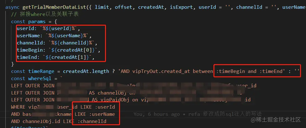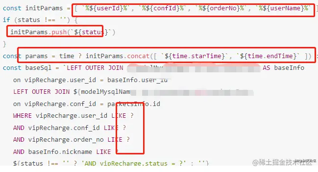ON 某A表.id = 某B表.user_id WHERE hx_user.is_virtual = 0 ${time};`,