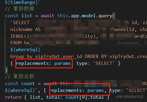 因为拿到字段数据联表和拿到数据总数分开写的,当时为了测试只在第一个加了replacements,本以后后面再加在总数那里没事,结果一直报错,报错还很不明显,如果有类似写法的,直接两个都加上再测试吧~