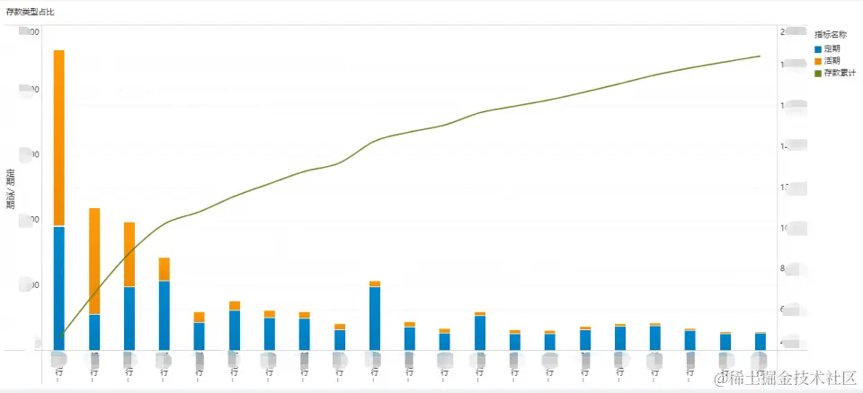 制作这样的分析图表,其实很简单。通过FineBI,财务人员只需要将分行名称、活期存储金额、定期存款金额等数据拖拽到相应位置,不到一分钟,就能做出上图的分析图表,如还想进行更深层次的探索分析,还可以随时调整分析模型,十分灵活。