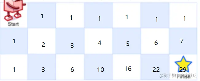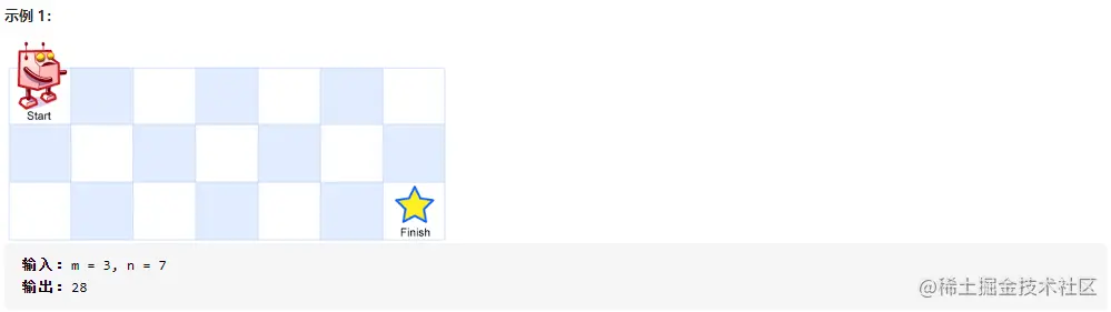 一个机器人位于一个 m x n 网格的左上角 (起始点在下图中标记为 “Start” )。