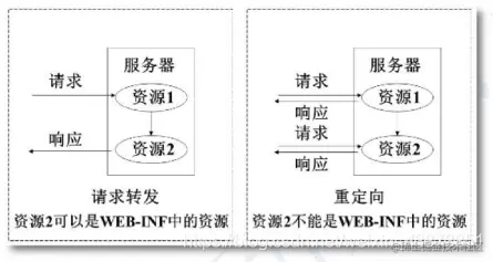 注意,对于请求转发的页面,可以是WEB-INF中页面;而重定向的页面,是不能为WEB-INF 中页的。因为重定向相当于用户再次发出一次请求,而用户是不能直接访问WEB-INF中资 源的。