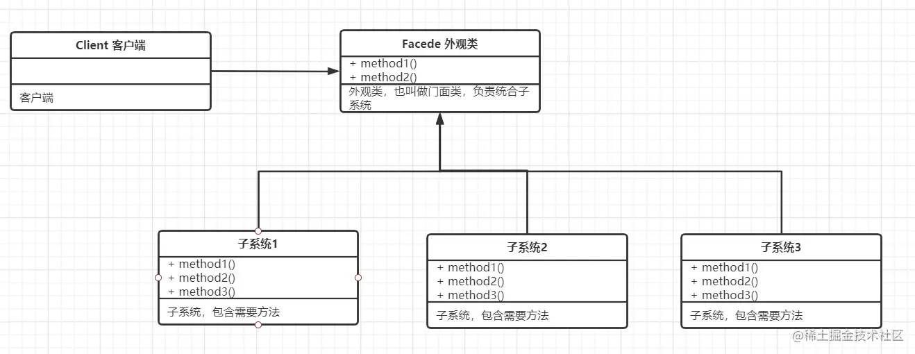 - 让接口方法更加简单,将子系统与外界交互的任务进行聚合