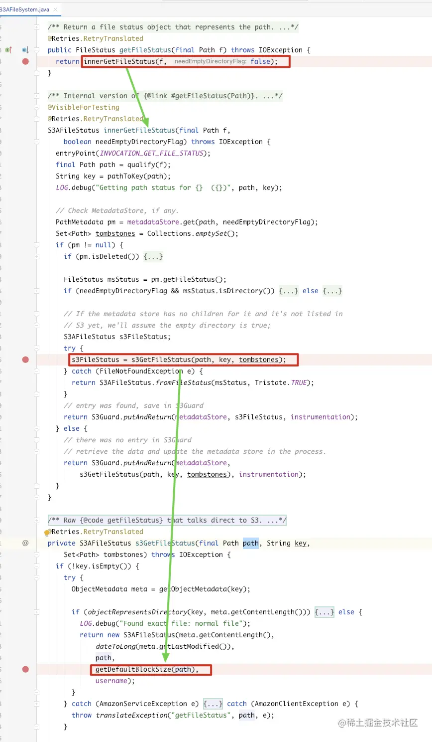 获取文件的 blockSize,在 FileSystem 里的流程调用 getFileStatus 获取详情信息,S3AFileSystem 继承了 FileSystem,并重写了该方法